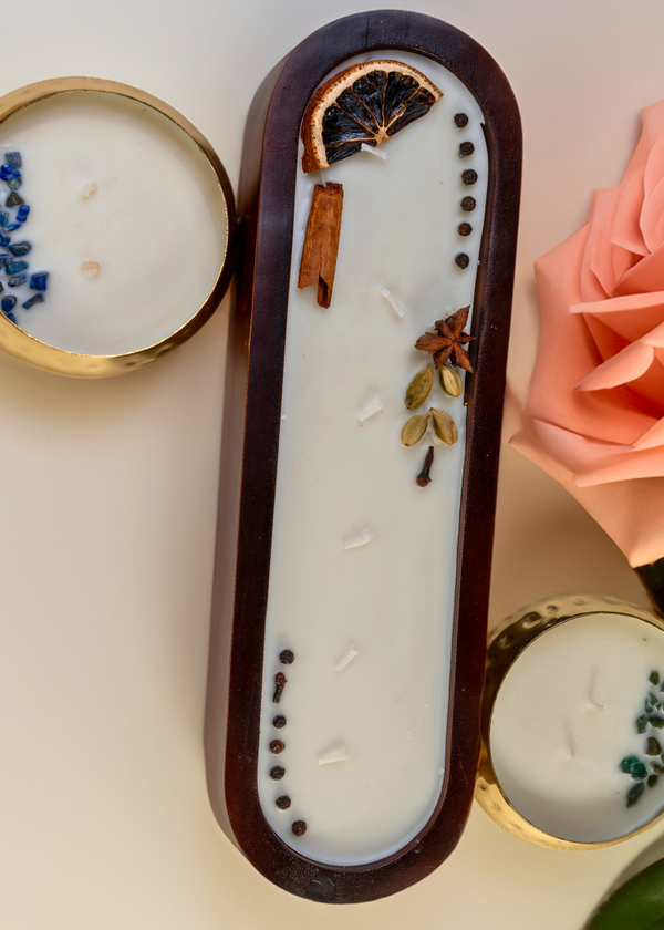 Handcrafted with essential oil blends and infused with Ayurvedic wisdom, our soy candles are designed to reduce anxiety and support emotional balance. Each candle creates a calm, restorative atmosphere while adding understated beauty to your home.