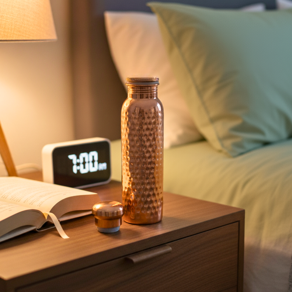 Our premium copper water bottle harnesses the natural antimicrobial properties of pure copper to support your wellness journey. Designed for hydration with intention, each sip honors Ayurvedic tradition—where storing water in copper vessels is believed to balance the three doshas and support overall vitality.