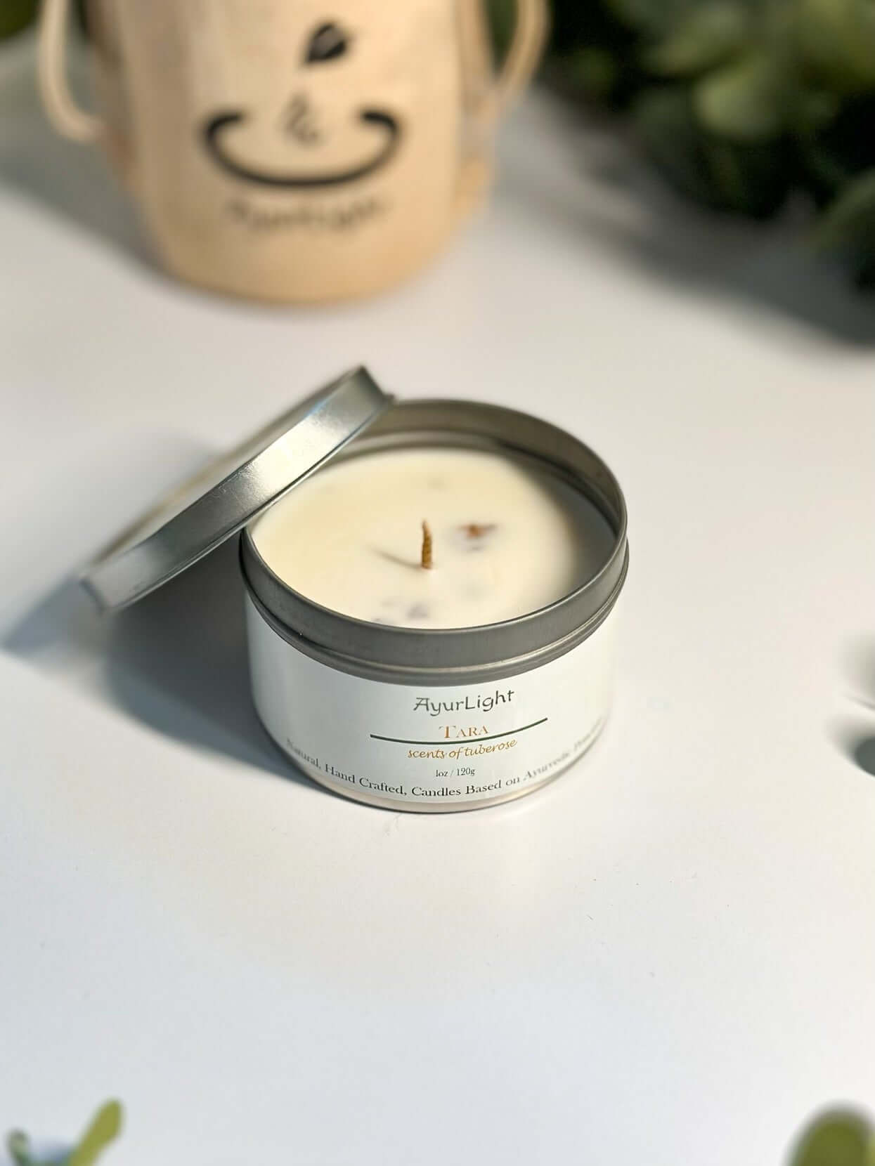 mini TARA: A mini version of our beloved TARA candle, this candle features the intoxicating fragrance of Tuberose, a flower long celebrated in Ayurveda and traditional wellness practices for its rich, sensual aroma.